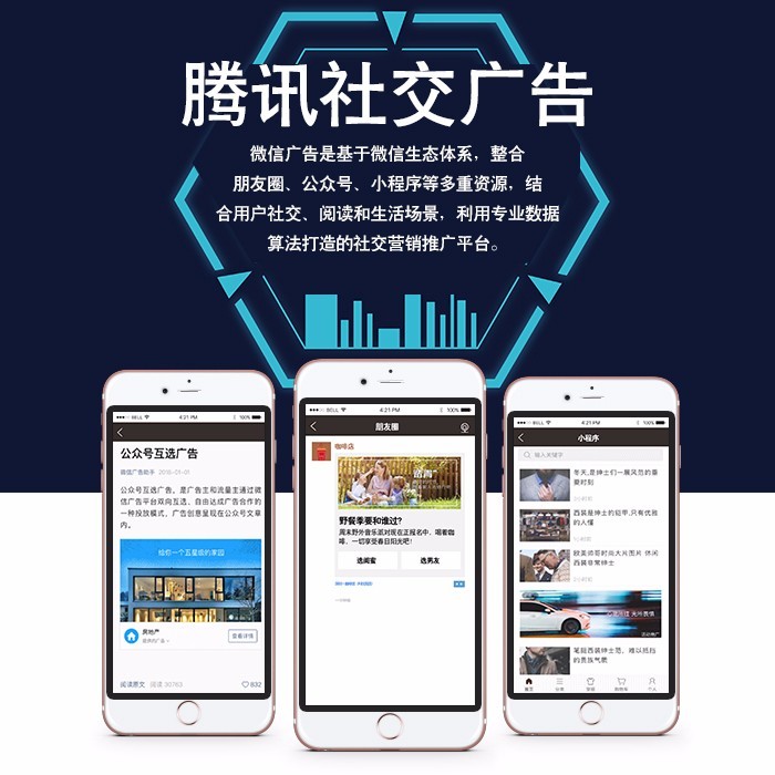 微信廣告是基于微信生态體系,整合朋友圈、公衆号、小程序等多(duō)重資源,結合用(yòng)戶社交、閱讀和(hé)生活場(chǎng)景,利用(yòng)專業數據算(suàn)法打造的(de)社交營銷推廣平台。